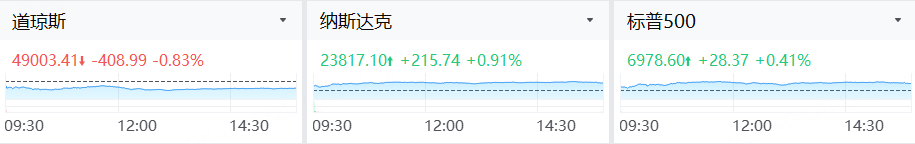周二(1月27日),美股三大指数涨跌不一。截至收盘,标普500指数涨0.41%五连阳创新高,报6978.60点;纳斯达克综合指数涨0.91%,报23817.10点;道琼斯指数跌0.83%,报49003.41点。