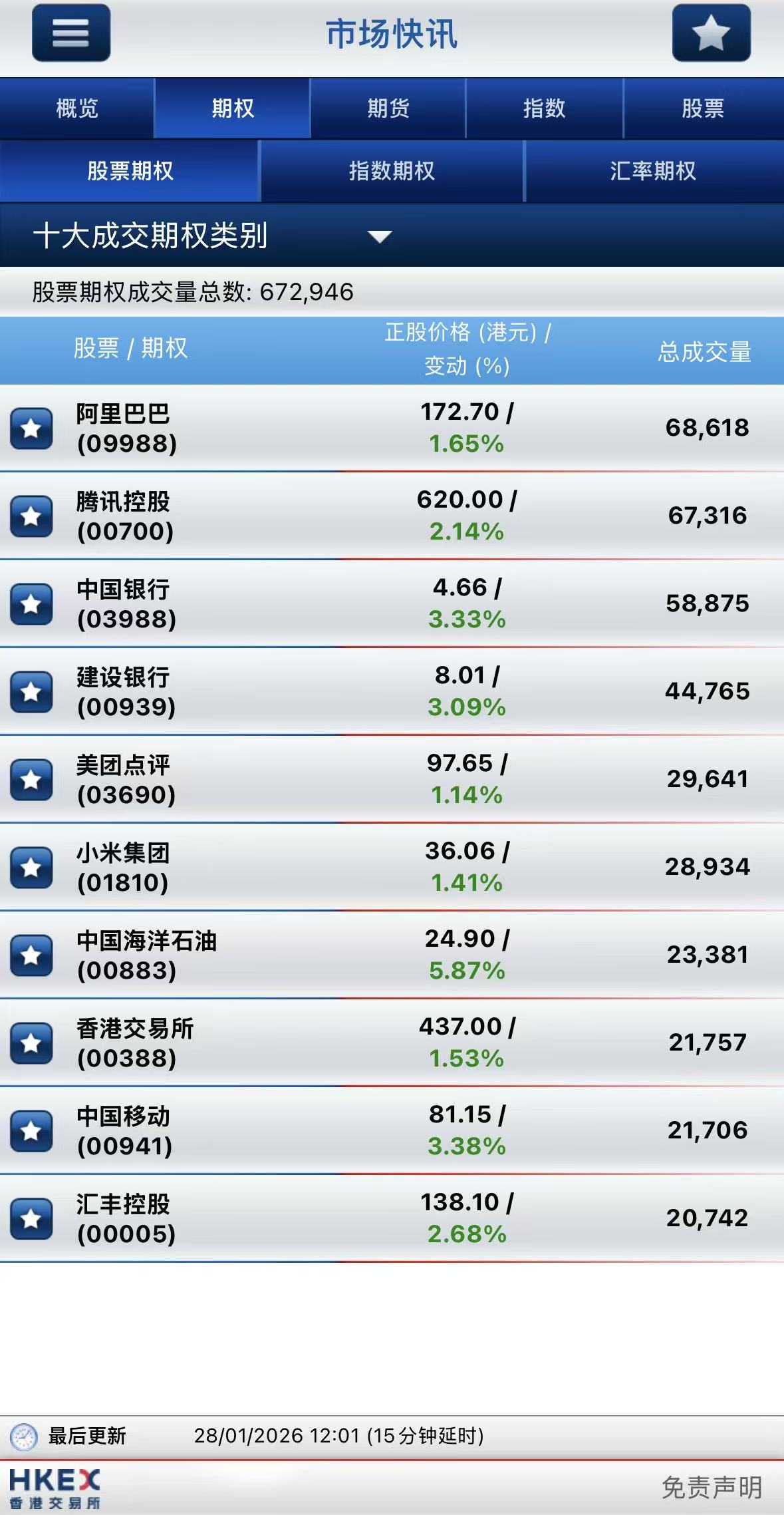 截止午间收盘,港股期权半日成交逾67万张,其中,阿里巴巴-W成交量居首,期权成交超6.8万张;腾讯控股名列次席,期权成交超6.7万张;中国银行位居第三,期权成交超5.8万张。