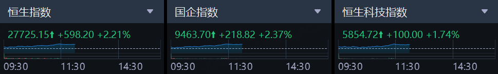 1月28日,港股上午盘三大指数高开高走,大金融股、科技股、中字头股等权重集体拉升助力大市上扬,截止午盘,恒生指数涨2.21%报27725点,创下2021年8月以来新高,国企指数涨2.37%,恒生科技指数涨1.74%。