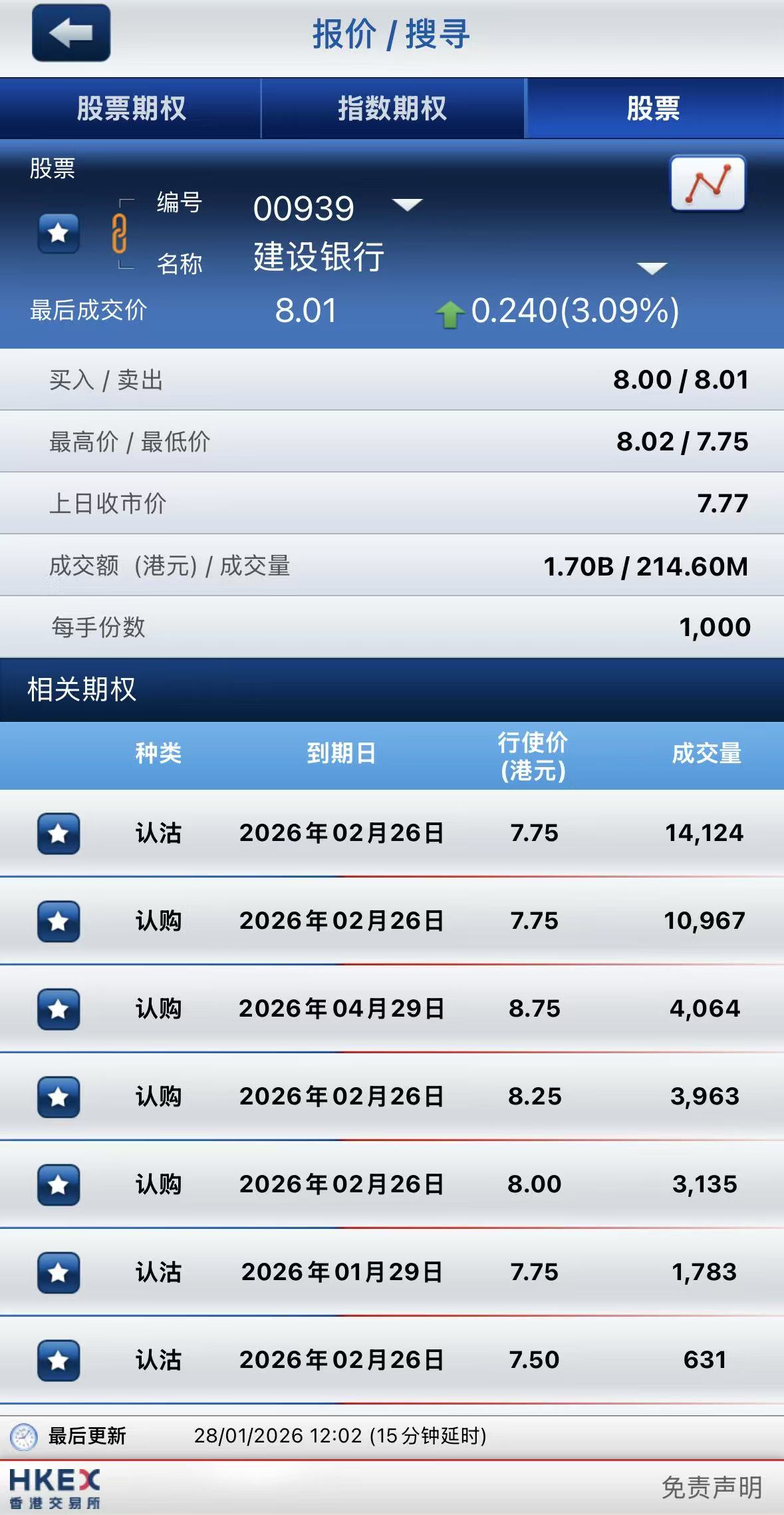 内银股延续升势,中国银行、建设银行均涨超3%;期权方面,中国银行期权成交量超5.8万张,其中2月26日到期行使价4.4港元的认沽期权成交居前,成交超3.5万张;建设银行期权成交量超4.4万张,其中2月26日到期行使价7.75港元的认沽期权成交居前,成交超1.4万张。