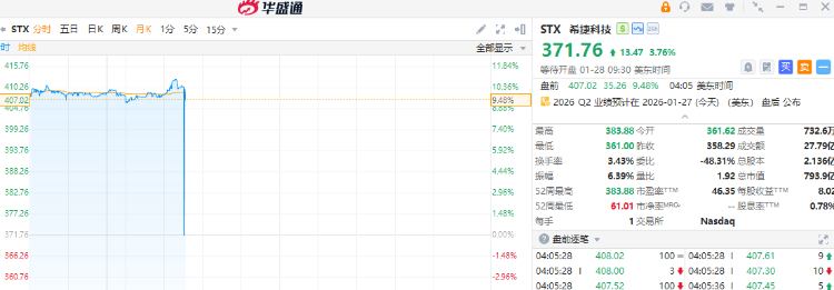 希捷科技绩后大涨10%带飞存储概念,截至发稿,美光科技涨超4%,SanDisk $SNDK 涨超5%。