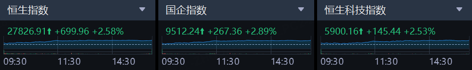 恒生指数、国企指数与恒生科技指数当日同步走高,市场风险偏好显著回暖。恒生指数收涨2.58%,报27826.91点;国企指数涨2.89%,报9512.24点;恒生科技指数涨2.53%,报5900.16点,红筹指数亦涨2.45%。成交额约3615亿港元,量能配合,显示资金对行情延续持乐观态度。盘面上,权重与题材齐发力,资源、周期与科网板块成为上行主轴,指数在午后维持强势至收盘,结构性行情扩散明显。