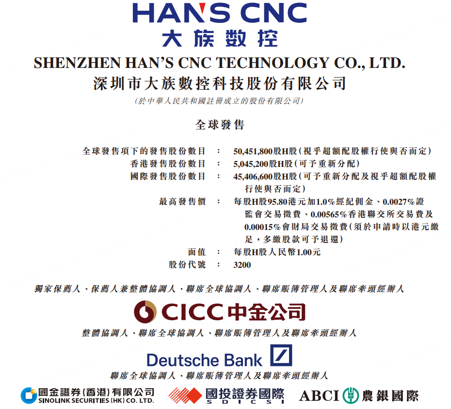 1月29日,大族数控发布公告,于1月29日至2月3日招股,公司拟全球发售5045.18万股,每股发售价不超过95.8港元,每手100股,入场费9676.61港元,预计将于2月6日开始在港交所挂牌交易。
