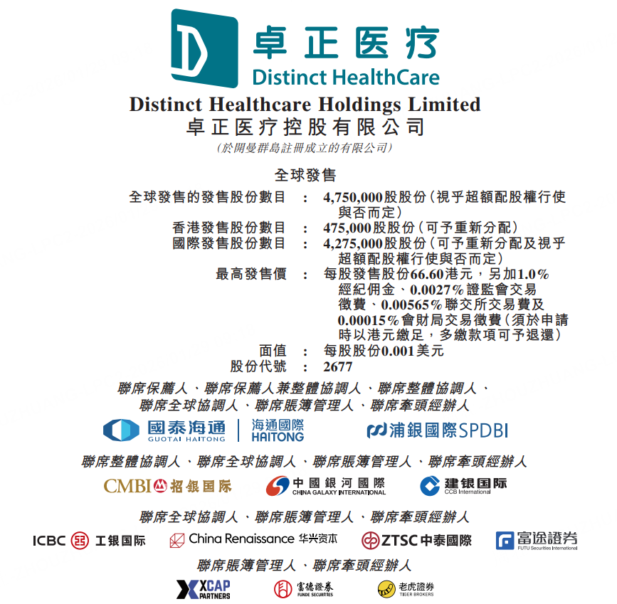 1月29日,卓正医疗发布公告,于1月29日至2月3日招股,公司拟全球发售475万股,每股发售价57.7-66.6港元,每手50股,入场费3363.58港元,海通国际及浦银国际为联席保荐人,预计将于2月6日开始在港交所挂牌交易。