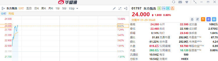 华盛资讯1月29日讯,东方甄选绩后涨近9%!成交额2.57亿港元。