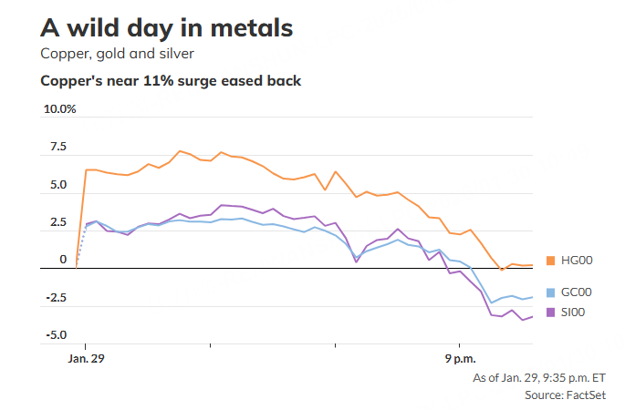 然而,最能体现当日剧烈波动的或许是铜价(HG00)的走势。下方图表显示,纽约时间上午9:30左右,铜价一度飙升约11%,随后又出现急剧回落。这种剧烈波动也波及了黄金(GC00)和白银(SI00)价格。