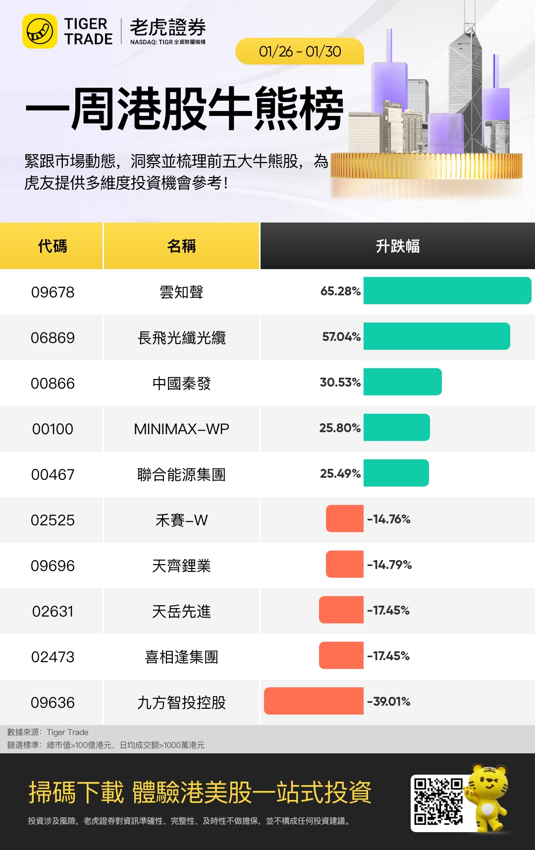 本周市值百亿以上、日均成交千万以上表现最好五只股票是 云知声 、 长飞光纤光缆 、 中国秦发 、 MINIMAX-WP 、 联合能源集团 ;