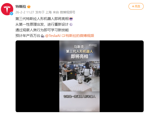 消息面上,据特斯拉官方微博:第三代特斯拉人形机器人即将亮相,从第一性原理出发,进行重新设计,通过观察人类行为即可学习新技能,预计年产百万台。另据TeslaAI:第三代人形机器人将在2026年亮相,它是特斯拉第一款走向量产的人形机器人。