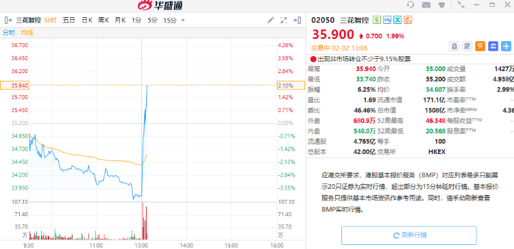 华盛资讯2月2日讯,港股机器人概念股午后短线拉升!三花智控转涨近2%,其他概念股跌幅纷纷收窄,优必选跌4%,越疆跌3%,蓝思科技跌2%。