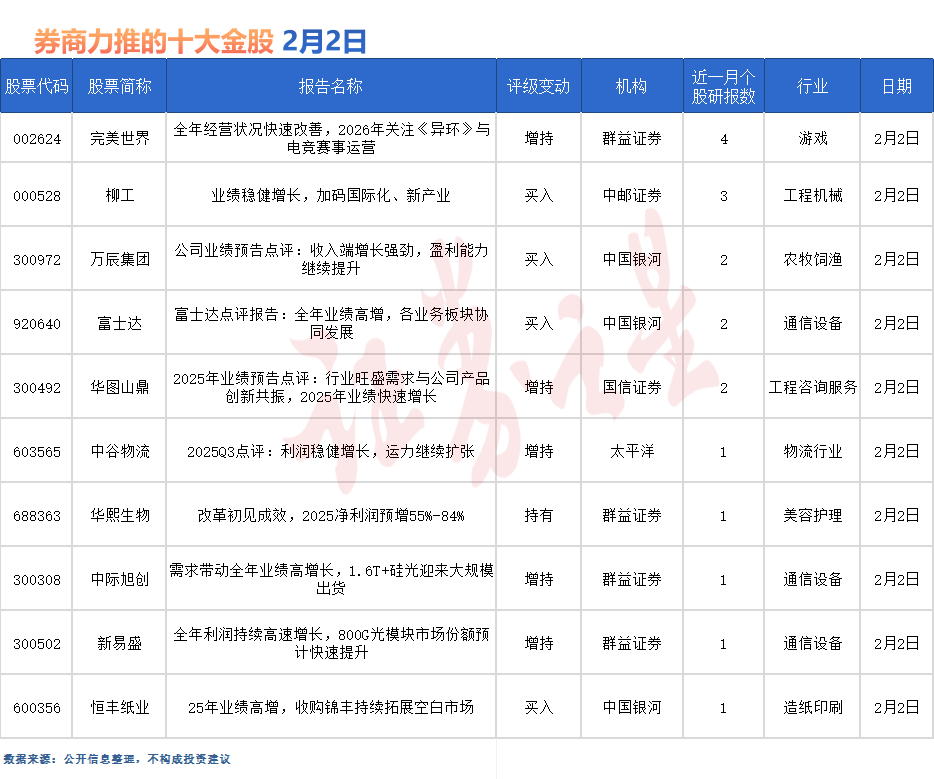 据证券之星数据库不完全统计,2月2日券商共给予超10家A股上市公司“买入”评级。从行业分布看,券商2月2日关注的个股聚焦于游戏、工程机械、农牧饲渔、通信设备、工程咨询服务、物流、美容护理、造纸印刷等行业。