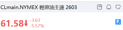 美油下跌逾5%至61.58美元/桶,美股西方石油盘前跌逾3%, 雪佛龙 跌逾1%, 埃克森美孚 跌2%。