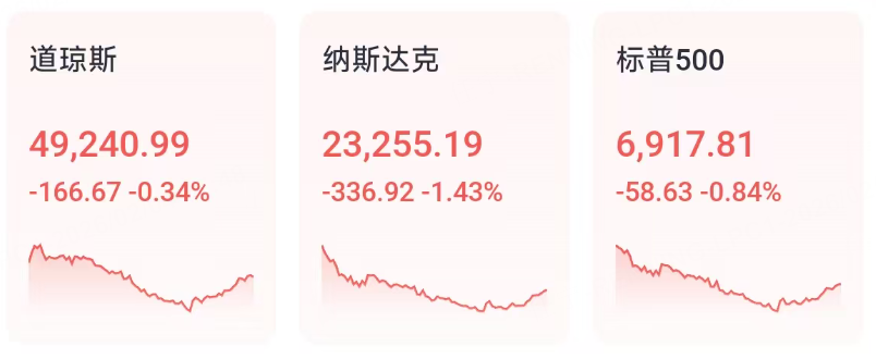 2月3日周三,美股三大指数集体收低。截至收盘,道琼斯跌0.34%,报49240.99点;标普500跌0.84%,报6917.81点;纳斯达克综合指数跌1.43%,报23255.19点。大型科技股多数走弱,市场关注业绩与指引分化对估值的影响。