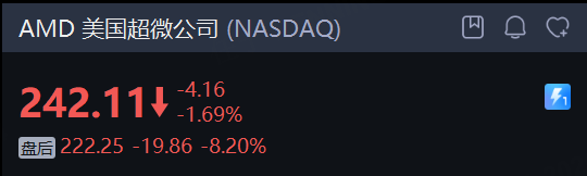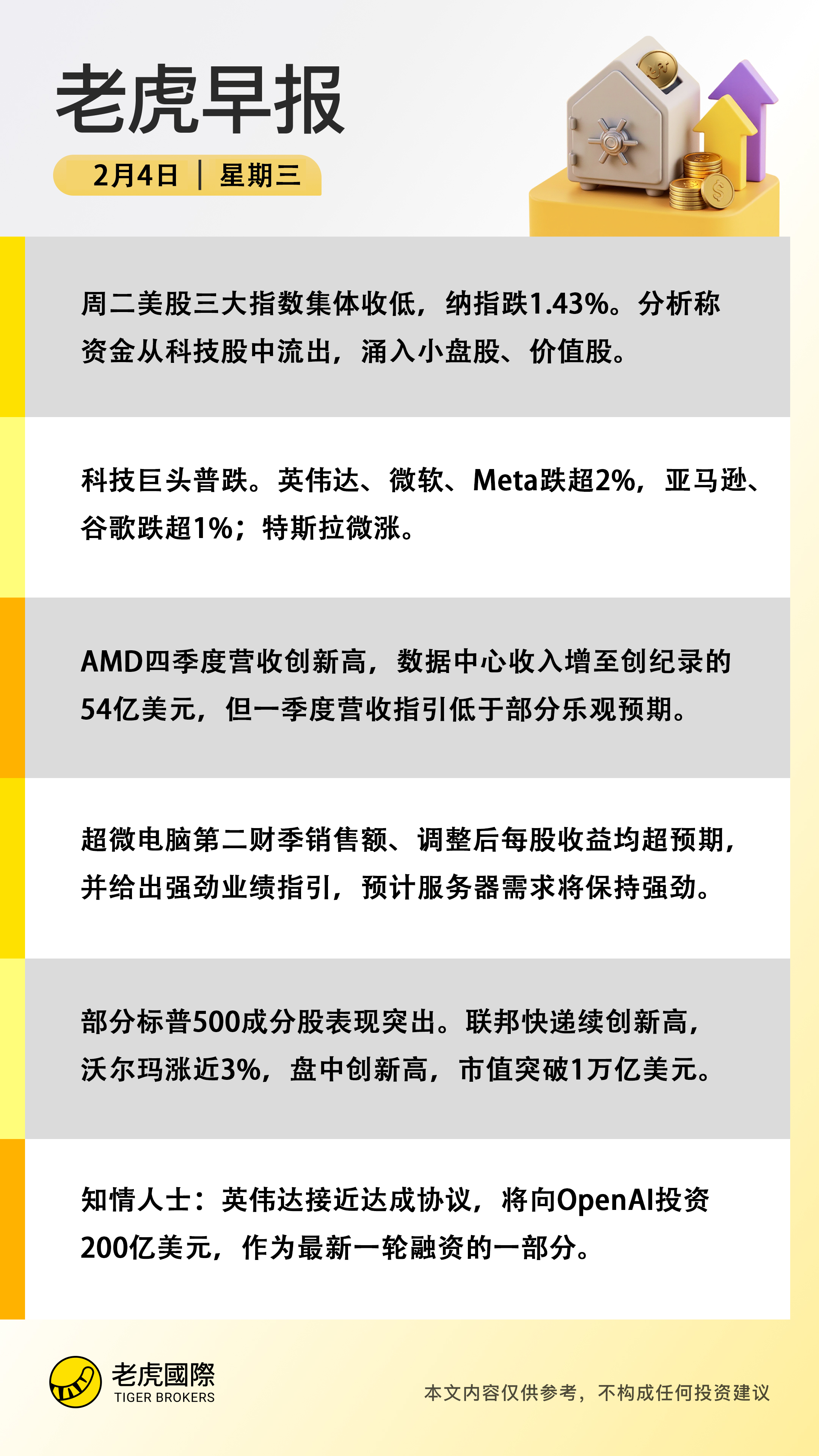 AMD盘后大跌超8%。Q4营收超百亿美元创新高、保持30%以上同比增速,EPS盈利增长放缓但较分析师预期高近16%,数据中心收入增至创纪录的54亿美元,MI308芯片在华销售收入约3.9亿美元,美出口限制造成2025年约4.4亿美元的存货及相关费用项影响;Q1营收指引中值98亿美元,略高于共识预期,但低于超过100亿美元的部分乐观预期。