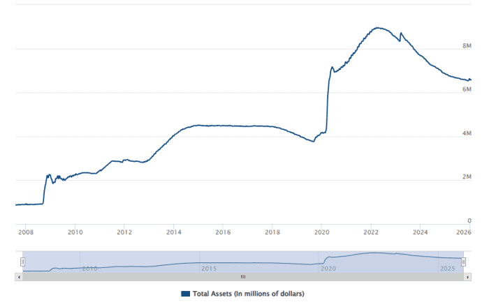 折线图显示美联储从 2008 年到 2026 年的总资产,在 2022 年达到近 9 万亿美元的峰值,到 2026 年下降到 6 万亿美元以下。