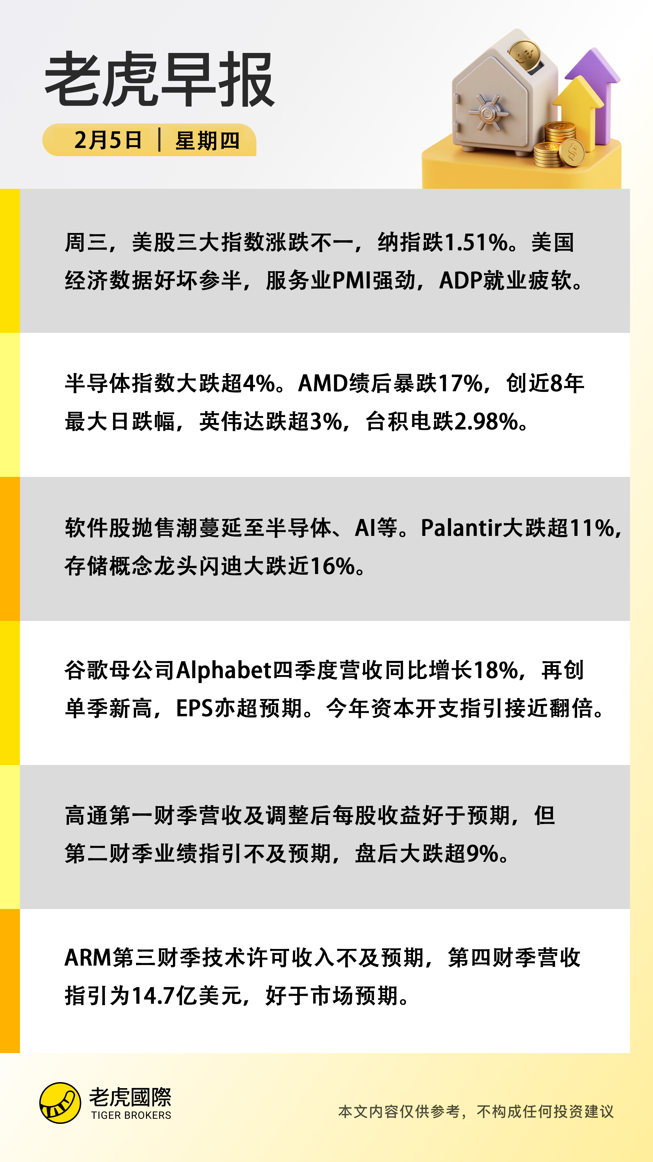 半导体指数大跌超4%。AMD绩后暴跌17%,创近8年最大日跌幅,英伟达跌超3%,台积电跌2.98%。