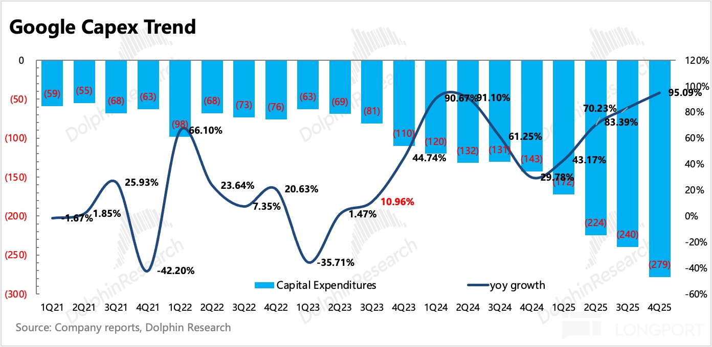 美东时间 2 月 5 日盘后,$谷歌-A(GOOGL.US) 发布了 2025 年四季度财报。只看当期业绩,虽然好坏参差,整体看还是解读为积极信号偏多。但吓到市场的,是惊人的资本开支指引——2026 年将翻倍增长,这无疑会让市场更加担心需求是否跟得上来。
