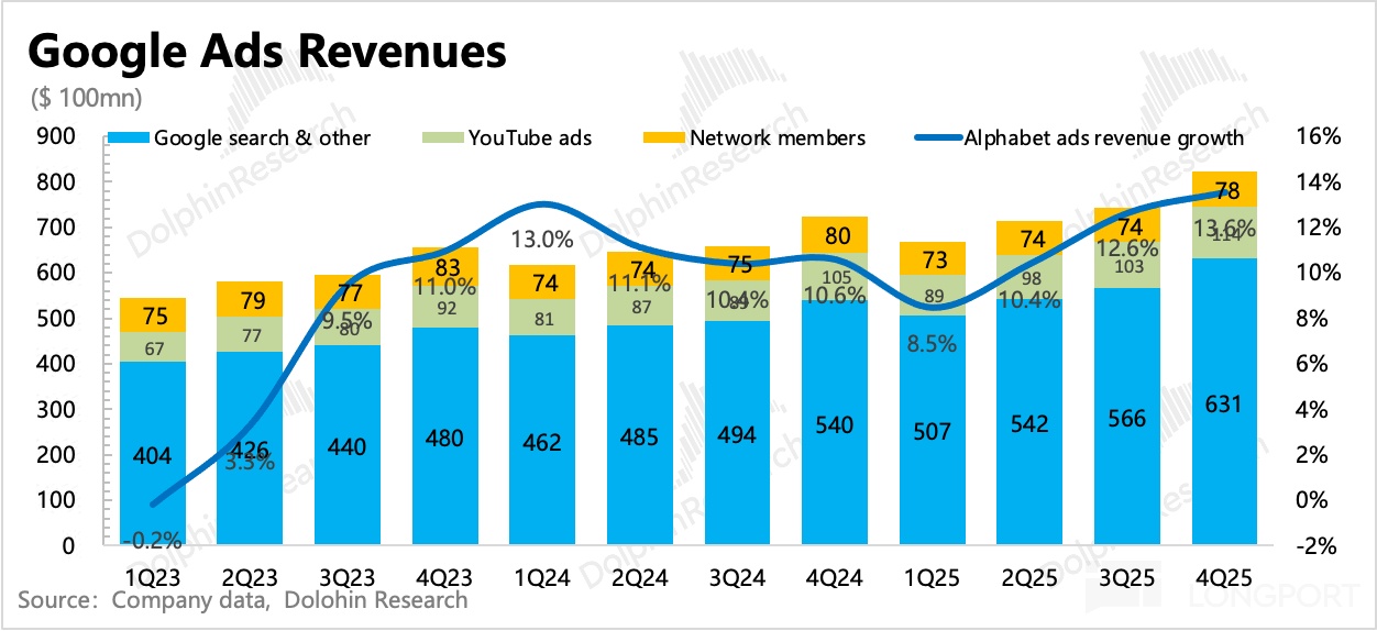 四季度广告收入 823 亿美元,整体增长 13.6%。核心搜索继续加速增长至 16.7%,强势的 Gemini 3 加持下,带动整体搜索继续回击 AI 颠覆论。但 YouTube 广告本季度却意外放缓,海豚君认为,可能与 Shorts 还没猛拉变现、YouTube TV 的品牌广告在四季度承压带来。