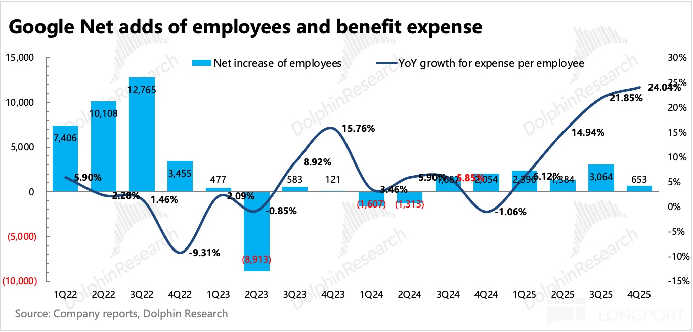 但从 Q3 开始,折旧费用就已经开始走高,同比 40%+ 的增长。预计随着 26 年天量 Capex 花出去,如果不做控制,总支出终究会飙涨。因此谷歌的人员调整还会继续,现在 Q4 净增员工数已经相较前三季度大大减少至 650 人。