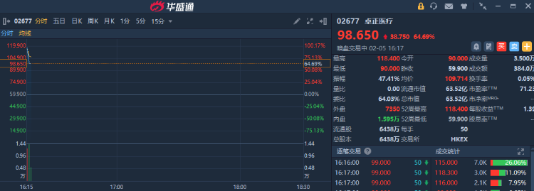 卓正医疗大涨64.69%,报98.65港元/股,中签一手账面浮盈1937.5港元,最新总市值超63亿港元。