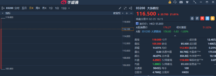 大族数控涨21.61%,报116.5港元/股,中签一手账面浮盈2070港元,最新总市值超554亿港元。