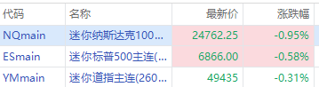 美股三大期指盘前普跌,纳指期货 $NQmain 跌0.95%,标普500期货 $ESmain 跌0.58%,道指期货 $YMmain 跌0.31%。