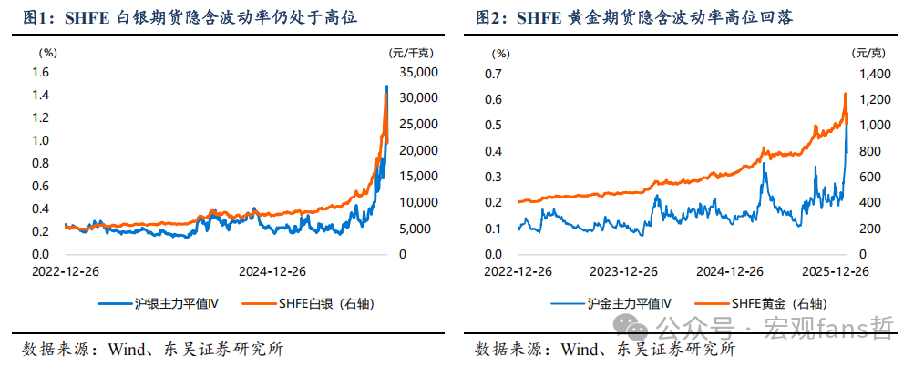 从波动率角度看,白银期货尚未度过流动性风险期。在1月份强势上涨过程中,黄金和白银隐含波动率均快速抬升,并且在本轮下跌过程中,白银期货甚至出现“升波跌停”,2月2日白银期货期权平值隐含波动率达到148%,2月3日白银期货打开跌停板之后,波动率也保持在100%,远远超出2025年平均27%的波动率水平,意味着白银期货虽然打开跌停板,但仍需“降波”完成从情绪到流动性层面的企稳。黄金期货期权波动率同样处于历史偏高水平,截至2月3日收盘,黄金期货平值隐含波动率保持在接近40%的高位,高于2025年全年平均19%的波动率水平。黄金仍需要时间、白银仍需要空间来消解尚未完全消除的流动性风险。