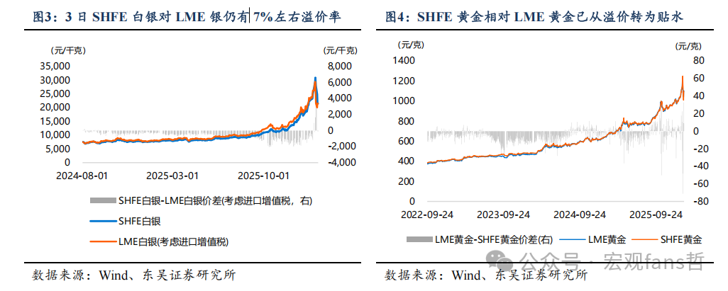 2026年2月3日,上期所白银期货打开跌停板,收盘于21,446元/千克,全天下跌16.71%。从内外盘白银价差看,当日伦敦白银现货收于79.2美元/盎司,考虑进口增值税后,SHFE白银期货相比LME白银溢价从1月末的29.8%回落至2月3日收盘时的7.46%。2月4日凌晨SHFE白银主力合约夜盘收涨5.93%,报22,393元/千克。
