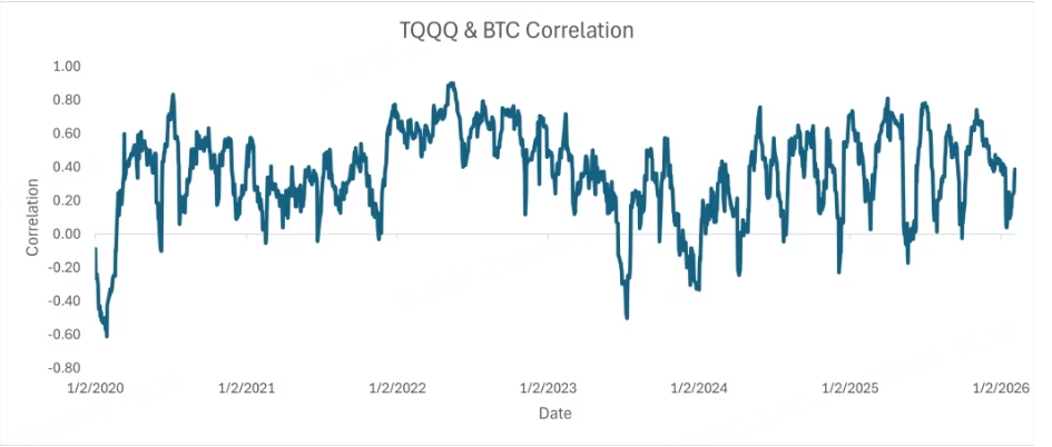 数据显示,比特币与纳斯达克100三倍杠杆ETF(TQQQ)的21日滚动相关性明显高于其与黄金的相关性。今年相关性一度高达0.78,近期仍维持在约0.4。