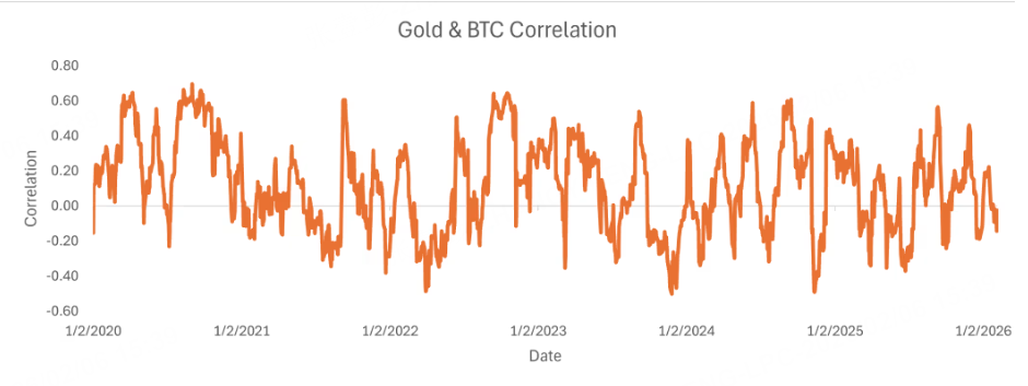 相比之下,比特币与黄金的滚动相关性仅为-0.03,几乎不存在联动关系。