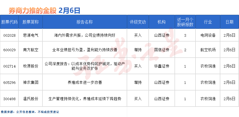 据证券之星数据库不完全统计,2月6日券商共给予6家A股上市公司“买入”评级。从行业分布看,券商2月6日关注的个股聚焦于电网设备、航空机场、农牧饲渔等行业。