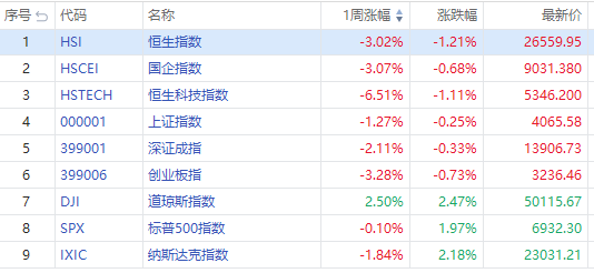 港股方面,本周恒生指数跌幅3.02%,报26559.95点;恒生科技指数跌幅6.51%,报5346.2点;国企指数跌幅3.07%,报9031.38点。