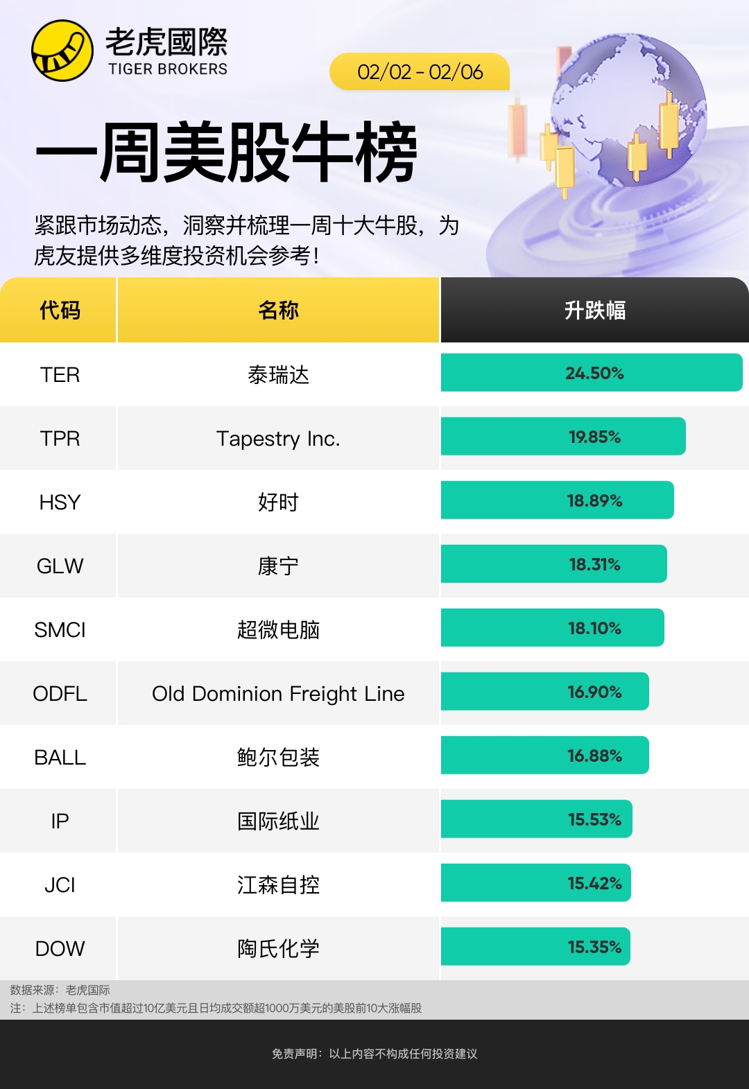 上周哪些股票表现优异?以下是截至2月6日当周,市值超过200亿美元的美国股票中涨幅前十名: