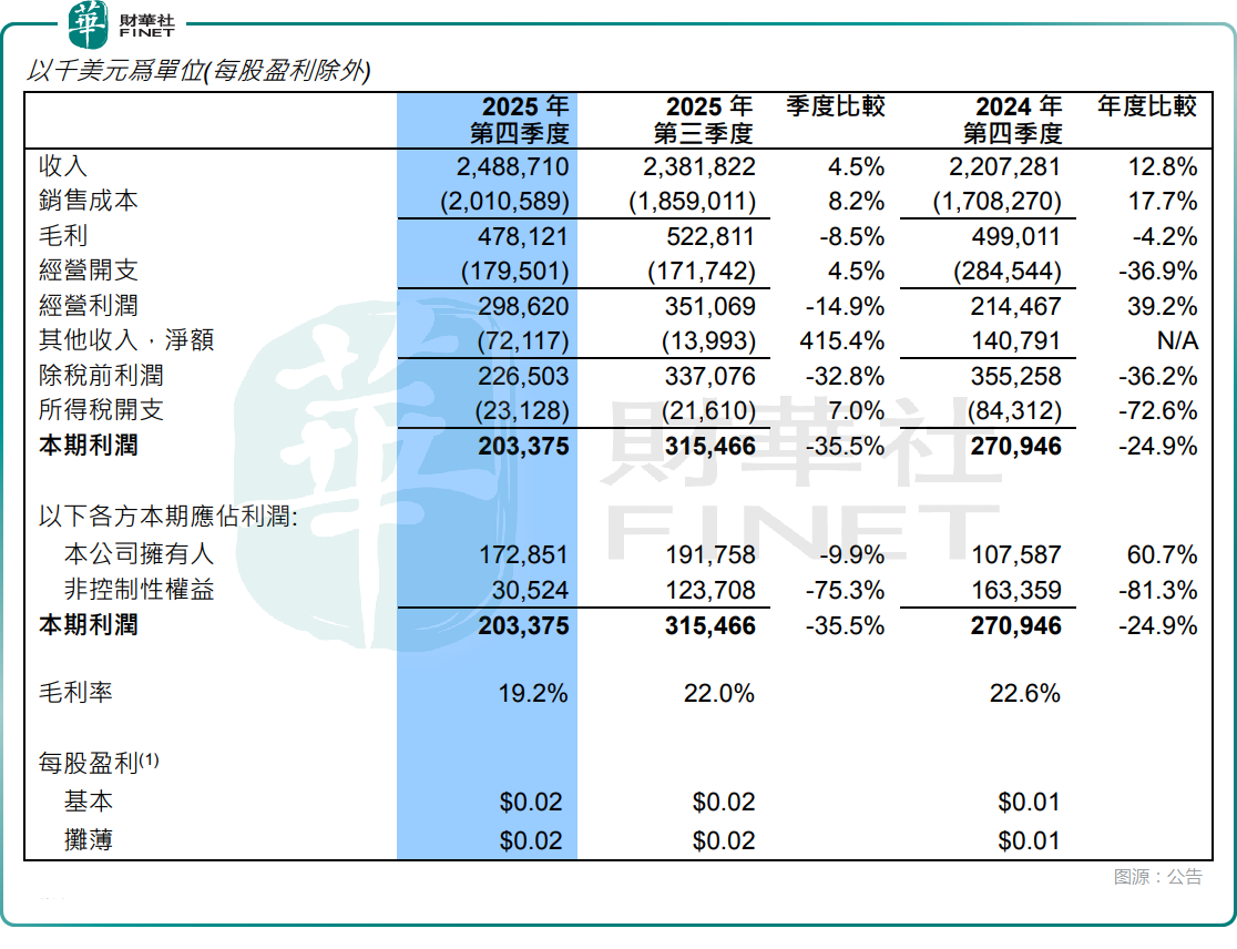 利润端,2025年第四季度,实现毛利4.78亿美元,环比下降8.5%、同比下降4.2%,毛利率为19.2%,较2025年第三季度的22.0%下滑2.8个百分点,主要受折旧成本增加影响;公司拥有人应占利润1.73亿美元,环比下降9.9%,同比大幅增长60.7%。