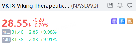 Viking涨近10%,计划推进口服肥胖症药物VK2735进入3期临床试验。