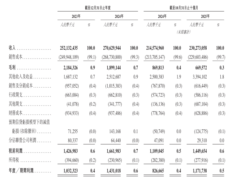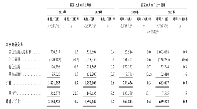 不过,表面亮眼的规模数据背后,难以掩盖公司经营层面的深层次隐忧,盈利质量偏弱成为制约其发展的核心短板。招股书显示,公司毛利率持续下滑,从2023年的0.9%降至2024年的0.7%,2025年前十个月进一步下滑至0.3%,较2023年下降66.7%。分产品来看,核心业务黑色金属及原材料毛利率从2023年的1.3%波动至2025年的0.9%,而化工品类毛利率更从2023年的-0.2%波动至2025年的-0.6%,主营业务盈利能力持续恶化。