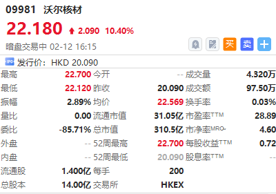 华盛资讯2月12日讯,港股海致科技集团、沃尔核材正在暗盘交易中。截至发稿,海致科技集团涨超232%,中签一手账面浮盈12588港元,最新总市值超360亿港元;沃尔核材涨超10%,中签一手账面浮盈418港元,最新总市值超310亿港元。