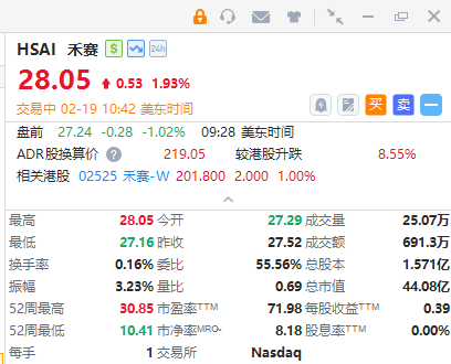 华盛资讯2月19日讯,热门中概股涨跌不一,禾赛涨近2%,小马智行、华住涨近1%;