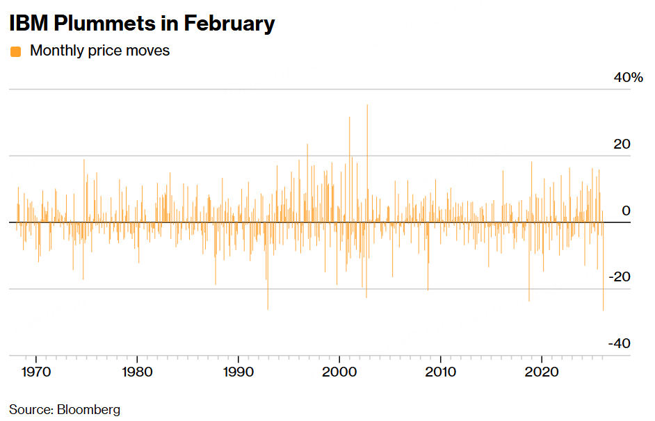 该股暴跌 13%,创下自 2000 年 10 月以来最大的单日跌幅。彭博社汇编的数据显示,受此影响,IBM 股价在 2 月份已下跌 27%,有望创下至少自 1968 年以来最大的单月跌幅。