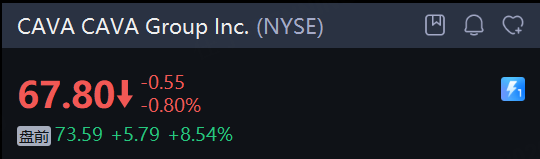 CAVA Group Inc. 盘前涨超8%。CAVA四季度营收达到2.75亿美元,调整后每股收益为0.04美元,均高于市场预估。CAVA预计全年同店销售额将增长3%至5%,高于分析师平均预期的3.16%。