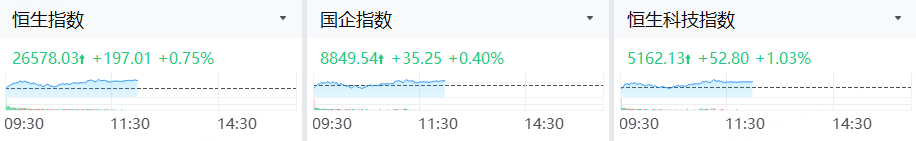 2月27日,港股三大指数齐涨, 截止午间收盘,恒生指数涨0.75%,恒生科技指数涨1.03%,国企指数涨0.40%。
