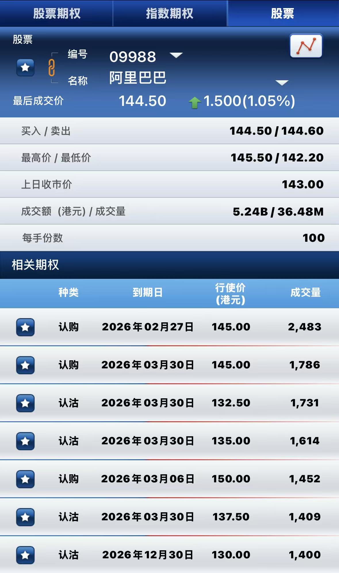 阿里巴巴-W涨超1%,半日成交超4.3万张合约,其中于2月27日到期行权价145港元的认购期权成交量居前,成交超2400张合约。 $ALB.HK 20260227 145.00 CALL$