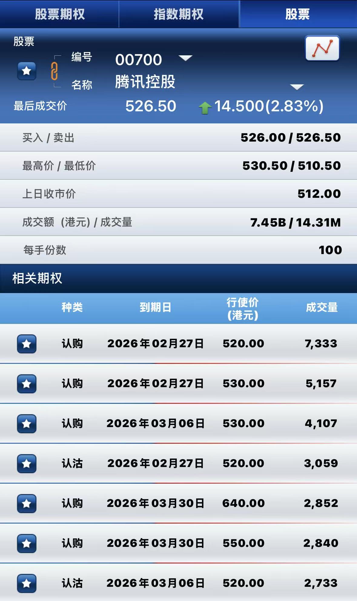 腾讯控股涨近3%,半日成交超8.5万张合约,其中于2月27日到期行权价520港元的认购期权成交量居前,成交超7300张合约。 $TCH.HK 20260227 520.00 CALL$