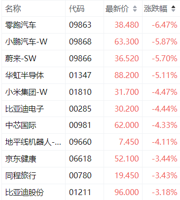 港股异动 | 科指跌幅扩大至2%,零跑汽车跌超6%,小鹏汽车、蔚来跌超5%
