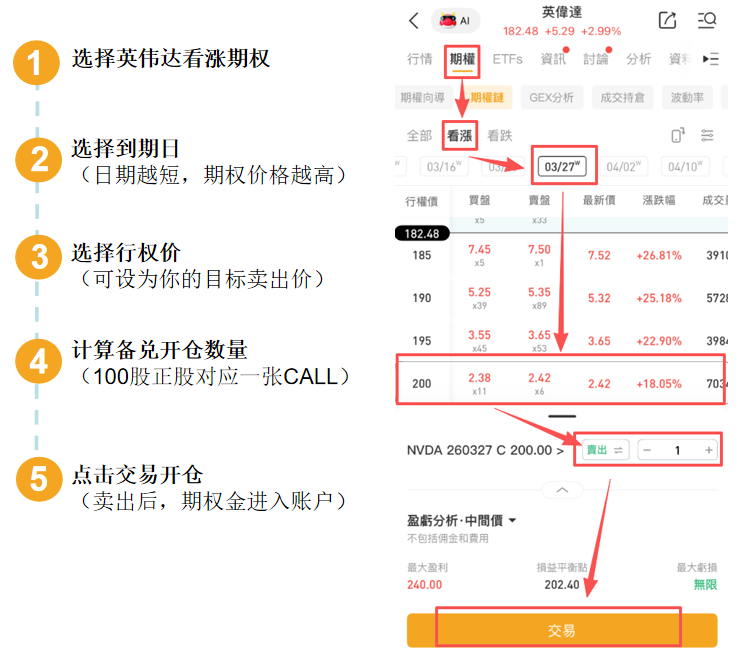 如何在华盛通平台构建专属Covered Call组合呢?以英伟达现价182美元为例,若你当前持有100股;合理备兑开仓,可卖出1张价外200美元、3月27日到期的看涨期权(NVDA_260327_C_200.0 )。