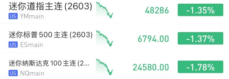 美股三大期指盘前走低,纳指期货 $NQmain 跌1.78%,标普500期货 $ESmain 跌1.37%,道指期货 $YMmain 跌1.35%