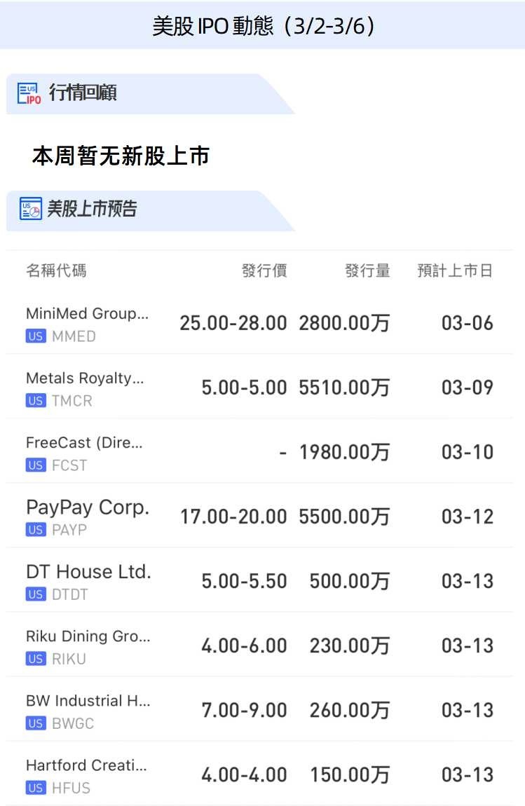 美股方面,下周有7只新股上市,可关注软银集团旗下日本最大移动支付应用程序公司PayPay $PAYA 赴美IPO,估值134亿美元。