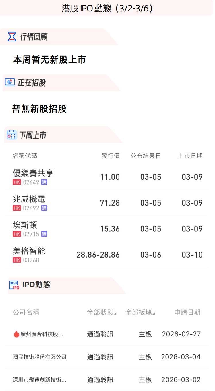 - 兆威机电:中国最大的一体化微型传动与驱动系统产品提供商,孖展认购倍数1186.38倍,预计3月9日上市