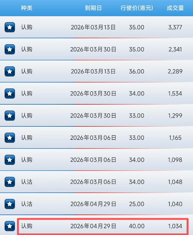 期权方面,小米认购合约成交积极,在上午的前十大榜单中占据八席。其中,一份4月29日到期的合约,行权价达到40港元。