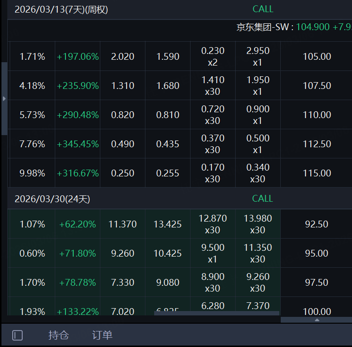 期权方面,京东集团的认购合约集体大涨,下周到期的多张合约涨幅超300%。