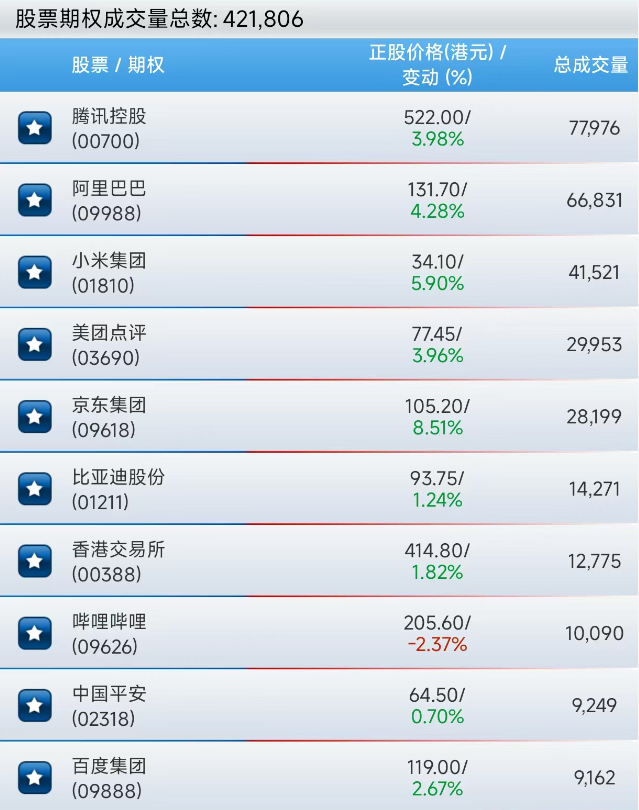 港股股票期权上午成交421806张合约。腾讯继续居首,阿里、小米、美团、京东、比亚迪等紧随其后。